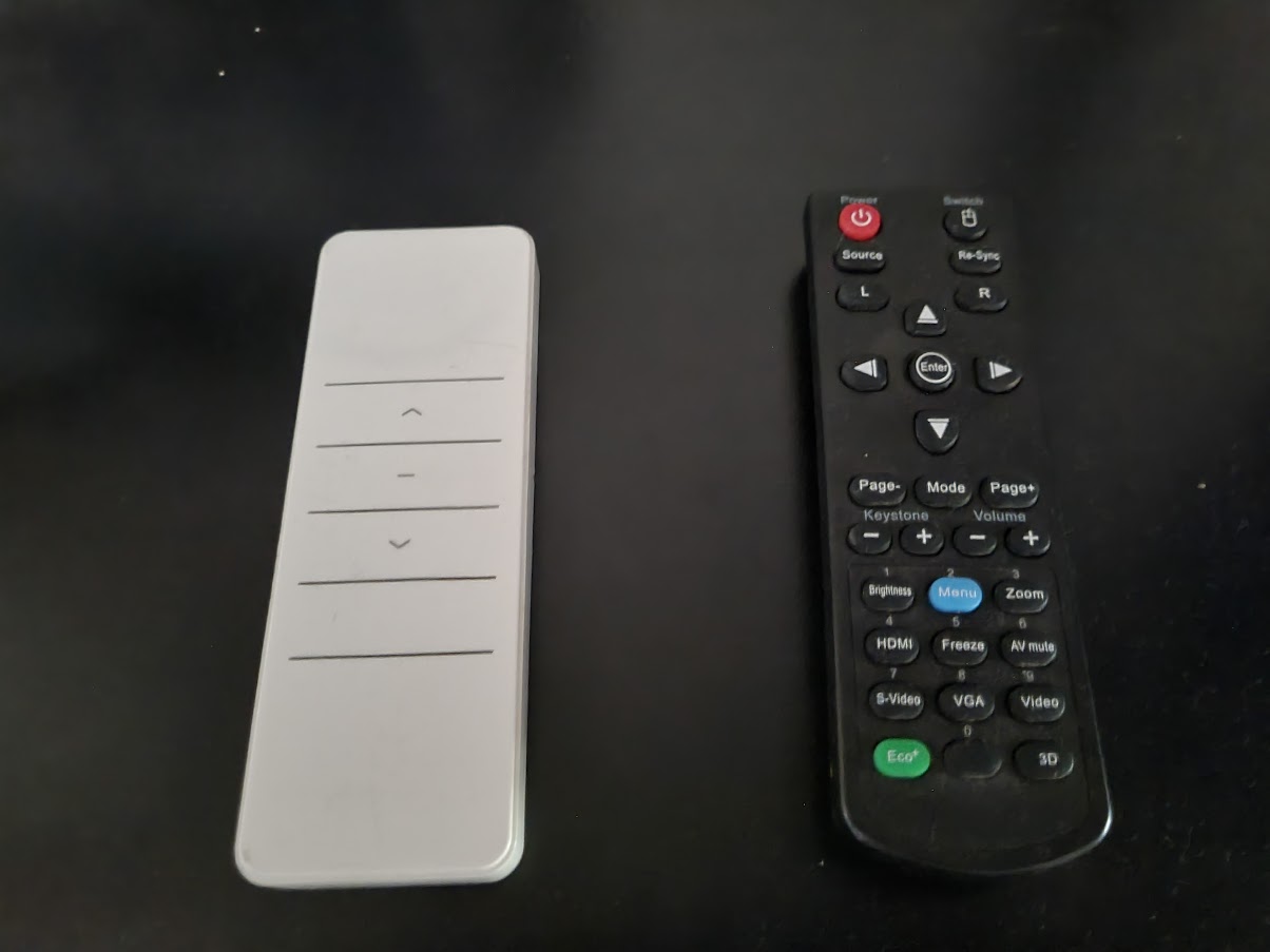 Daarnaast zijn er ook nog twee afstandsbedieningen: de witte voor het op- en neerlaten van het groot scherm en de zwarte voor de bediening van de beamer.