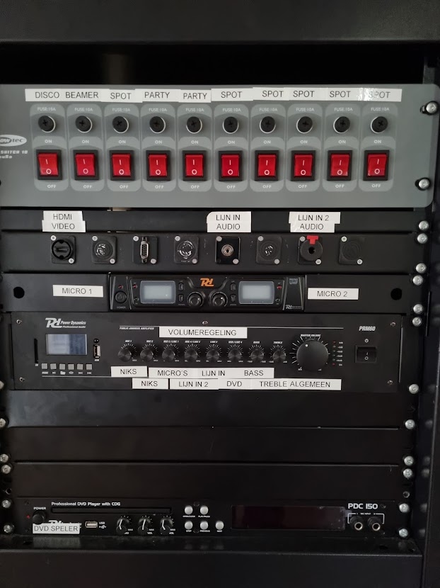 Versteek zelf geen kabels in de multimediakast of in de beamer.
